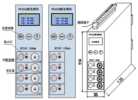 PD104系列直流配電控保模塊是DC24V直流配電系統(tǒng)控制保護(hù)模塊,以下簡(jiǎn)稱模塊,該模塊具備1路輸入、4路輸出控制電源,同時(shí)OLED液晶實(shí)時(shí)顯示4路電流值。