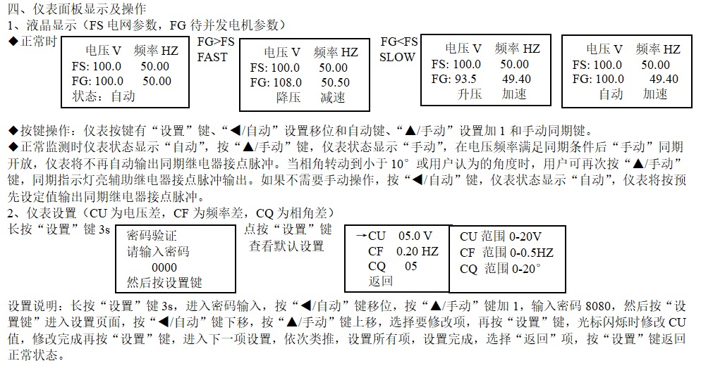 ◆ 同期完成0°指示燈常亮,儀表可長期處于電壓頻率監(jiān)測狀態(tài)。