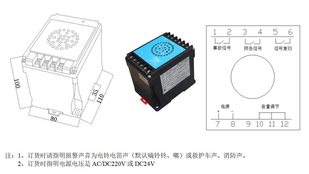 CAKJ-DDLF語音報警器,是為電力系統(tǒng)中央信號報警而設計的一款低功耗、無干擾、大音量電子式報警設備。采用單片機模擬電磁式電鈴電笛聲音頻譜,其發(fā)聲與電磁式電鈴電笛發(fā)聲相似度達98%。且具備報警信號保持及遠程復歸功能。