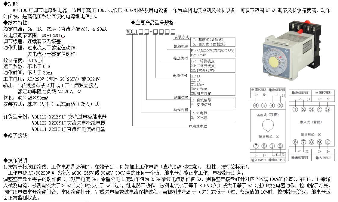 WDL100可調(diào)節(jié)電流繼電器,適用于高壓10kv或低壓400v線路及用電設(shè)備,作為單相電流檢測及控制設(shè)備。可調(diào)節(jié)范圍0~5A,調(diào)節(jié)及檢測精度高,動(dòng)作時(shí)間快,是高低壓系統(tǒng)簡便可靠的電流繼電保護(hù)。