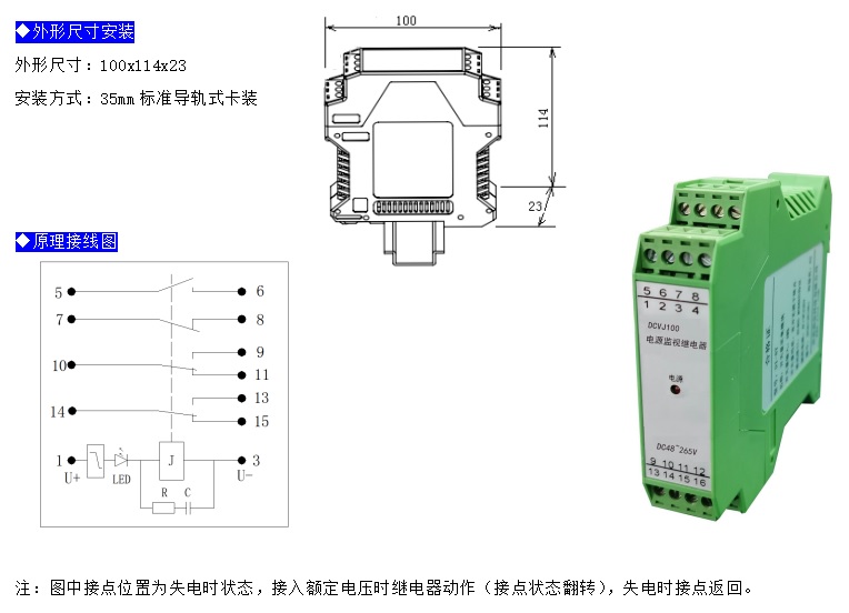 DCVJ電源監(jiān)視繼電器,適用于直流系統(tǒng)電源失電監(jiān)視,當(dāng)電源電壓正常時(shí)繼電器動(dòng)作,同時(shí)LED電源指示燈亮起,當(dāng)電源電壓低于30V或電源消失,繼電器將延時(shí)0.5s后返回,同時(shí)LED指示燈熄滅。