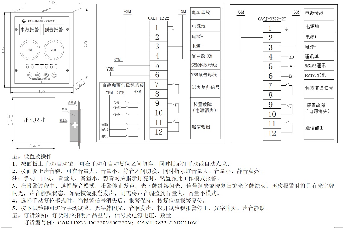 CAKJ-DZ22中央音響裝置,是為電力系統(tǒng)中央信號聲光報警而設計的一款低功耗、無干擾、大音量電子式報警設備(音量可調節(jié),可靜音)。采用單片機模擬電磁式電鈴電笛聲音頻譜,其發(fā)聲與電磁式電鈴電笛發(fā)聲相似度達98%。且具備報警信號保持(自動及手動復位)及遠程復歸功能。